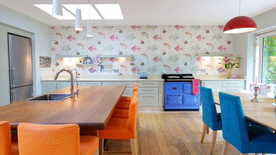 The result is a dramatic open-plan kitchen and dining room with pale oak flooring. Turquoise, orange and pink which feature in the fish wallpaper by Osborne and Little, have been accented throughout the room.