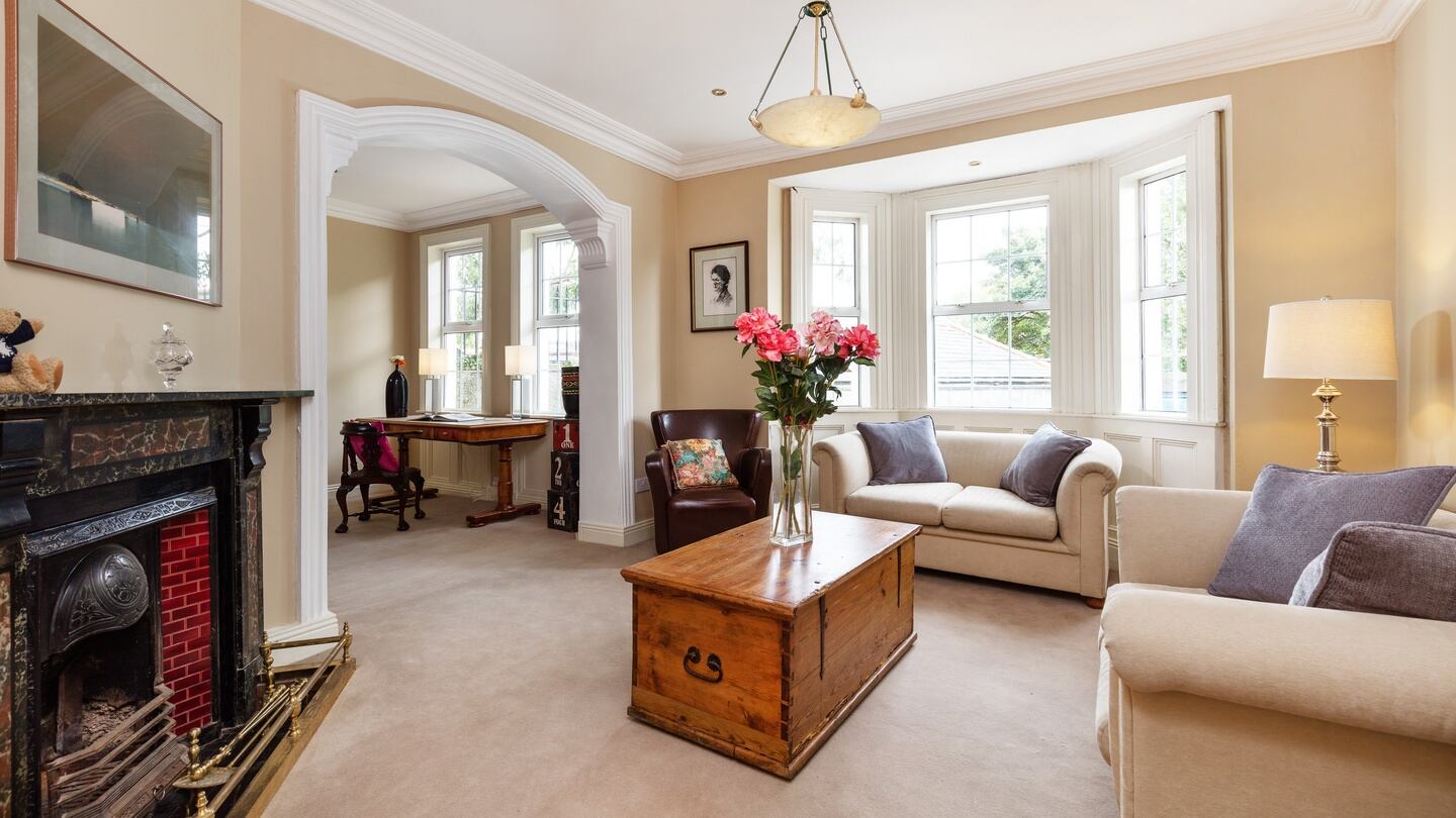 The circling curve of space to the front effectively contains four rooms, distinguished by arches between them. The drawingroom has a bay window and an original, diagonal fireplace. There is a similar fireplace in the diningroom, this one with splendid inset tiles.