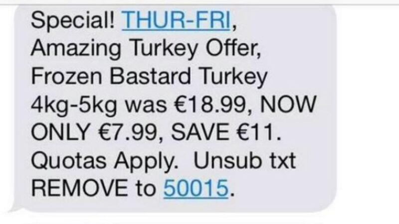 "Special! Amazing Turkey Offer," the message started innocently enough. "Frozen Bastard Turkey 4-5kg was €18.99 NOW ONLY €7.99," it added somewhat surprisingly.